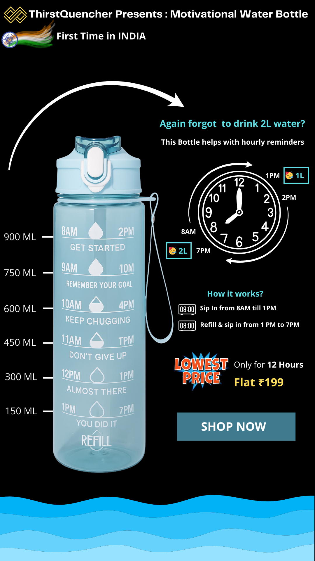 Meet your perfect hydration partner – the Motivational Water Bottle! With hourly time markers and inspiring quotes, this bottle keeps you on track to drink enough water every single day. Just sip 150ml every hour, and you’ll hit your 2L daily goal effortlessly.
